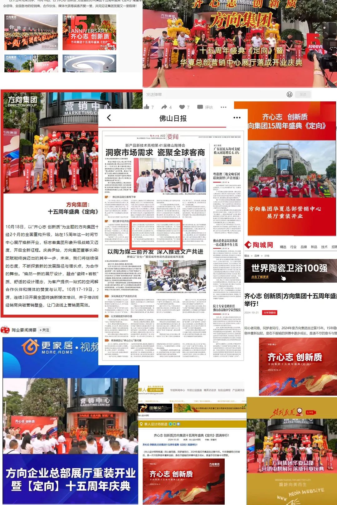 4日展会时间,方向集团不仅获得了行业大咖的认可和支持,还得到了智造联盟、陶城报、陶瓷信息、中国陶瓷网、华夏陶瓷网、陶业要闻、陶瓷资讯、中国陶瓷家居网、设计好物、众创社、华人设计网、直线传媒、陶瓷壹周、建材天地、佛山日报多家行业主流、权威媒体争相关注报道,刷屏行业头条,成为本届陶博会的关注焦点!